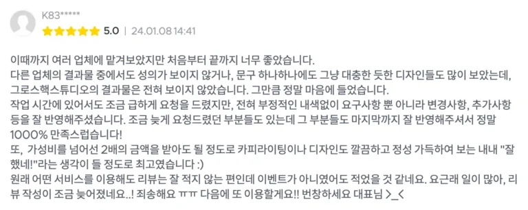 또한, 그로스 디자인랩을 찾지 않으시더라도 위 기준으로 상세페이지 제작업체를 선정하실 경우 실패 없는 상세페이지 프로젝트 진행이 가능하시리라 생각합니다.