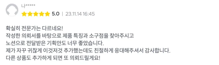 생각했던 것과 기획 방향성이 안 맞거나 제품의 소구점을 충분히 녹여내지 못했다고 판단되실 경우 이유 불문 100% 환불해드리고 있습니다.